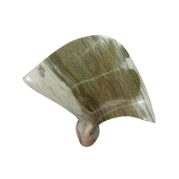 Description: Sourced from Zimbabwe, this Shona stone sculpture is carved out of butter jade stone, depicting an abstract “leaf” type shape. It is handcrafted, with amazing detail and finish. The coloration exhibits a beautiful mixture of creamy yellow, green, beige and grey.